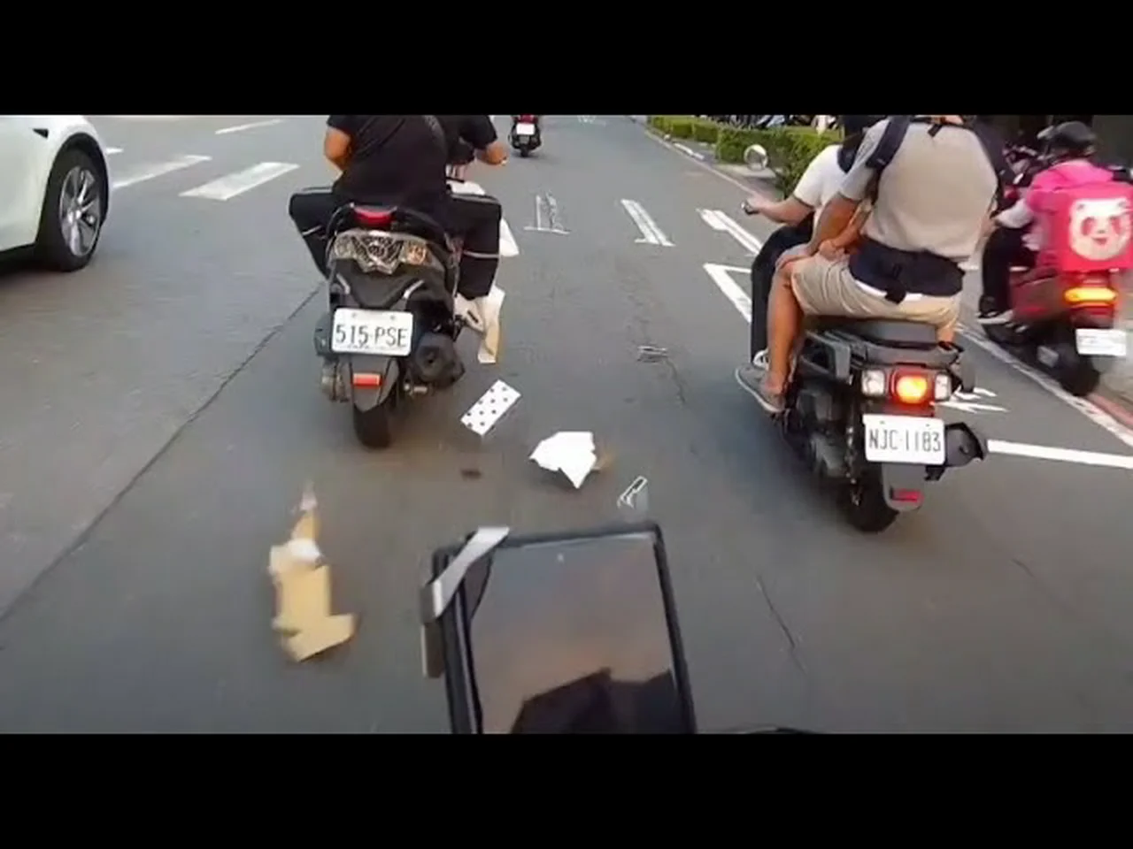 超車到我前面 送我吃一堆鐵片 馬的掉一堆死不停 當時碾到有滑一下 就打雙黃慢慢靠旁邊 想說他要停 我也檢查一下車子 結果他繼續騎