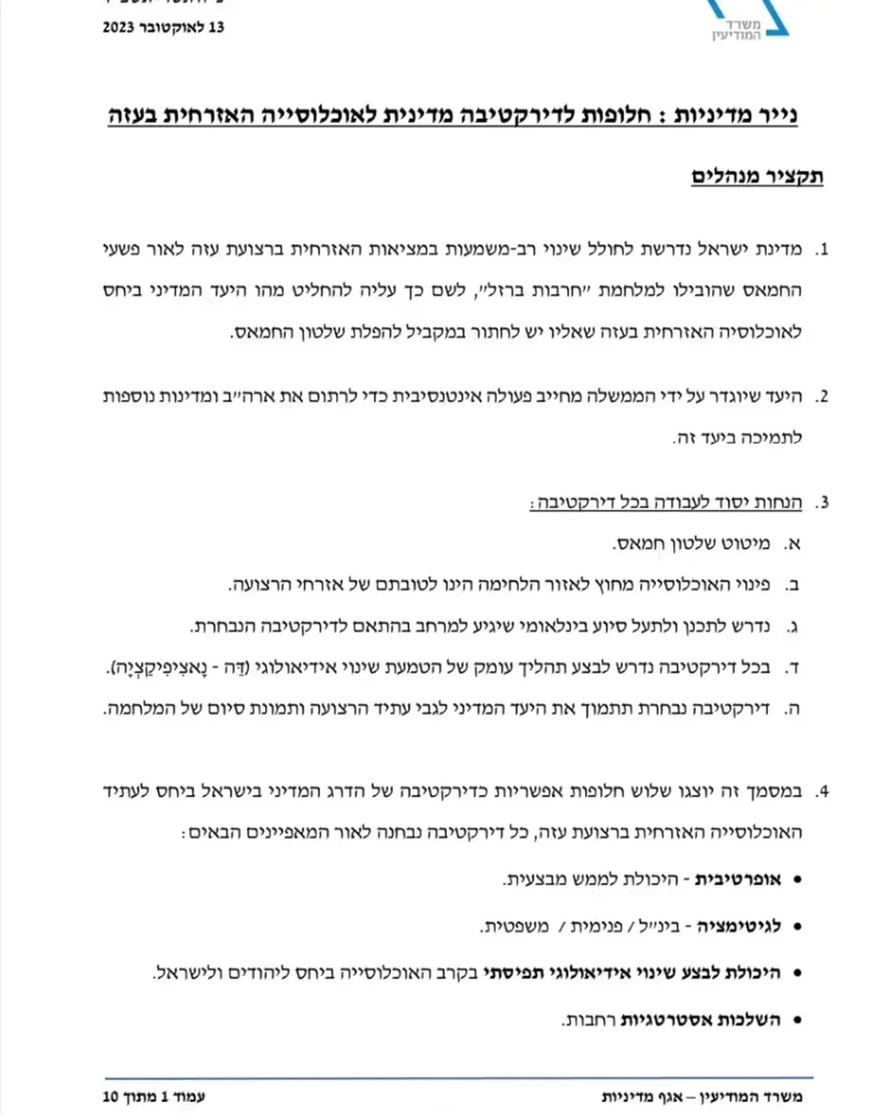 5️⃣ En outre, il est écrit que le gouvernement doit mener une campagne publique qui promouvra le programme de transfert dans le monde occidental «d’une manière qui ne noircisse pas Israël», dans laquelle la déportation de la population de Gaza sera présentée comme s’il s’agissait d’une mesure humanitairement nécessaire qui recevra le soutien du monde entier car elle entraînera «moins de victimes parmi la population civile par rapport au nombre de victimes attendu.»