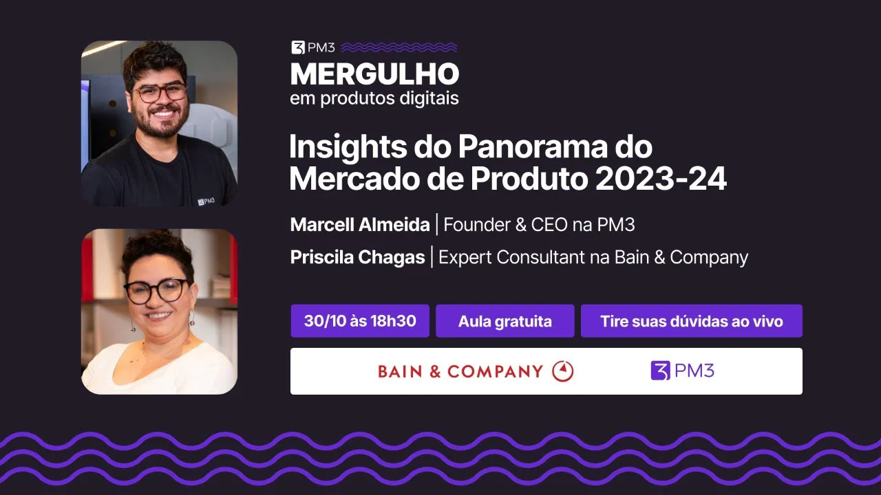 Aula 1 do Mergulho em Produtos Digitais com Marcell Almeida, CEO da PM3 e Priscila Chagas, Expert Consultant na Bain, empresa parceira na construção do Panorama de 2023-24.