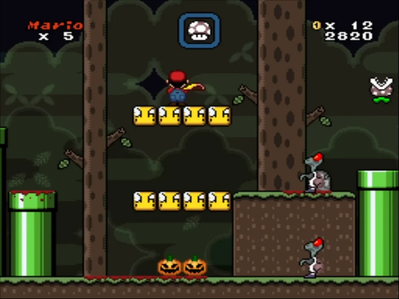 And the final game from the Halloween Special series is The Halloween Island, a hack of the SNES Super Mario World with an entire plot made specifically for Halloween, as the name of the hack already suggests. The game is about a giant masked Koopa that stared to haunt the island, just that, you have to find this giant Koopa and defeat it to bring the island back to normal. Some background, objects, and enemies sprites were redrawn to better match an horror themed game, like some level and pipe tiles got some blood on them, Halloween pumpkins were added to the levels, Koopas now being zombie Koopas, Hammer Bro like the classical Super Mario Bros was added with modified sprites that I don't know how to describe what it looks like, and many others like the overworld being remodelled to better match the game. The behaviour of some enemies was also changed. The game is not long, even though the levels look a little bit bigger than the original Super Mario World, there are only 9 exits, and the only boss present in the game is the Giant Koopa, the final boss, so mostly you will be able to beat it in less than one hour. This is the last game of the Halloween Special series, and I think it is a great way to finish it with a game that carries Halloween in its name. The game is not hard, it is kind of funny to play on Halloween. If you are a hardcore Mario enjoyer, this hack doesn't bring a lot of new stuff, but the way the levels are designed is actually quite nice, and it has its own challenges, even though you can overcome them pretty fast since the game is very short. I recommend you to play it if you are not in the mood to play a long game or if you feel like playing a Halloween / horror themed game.