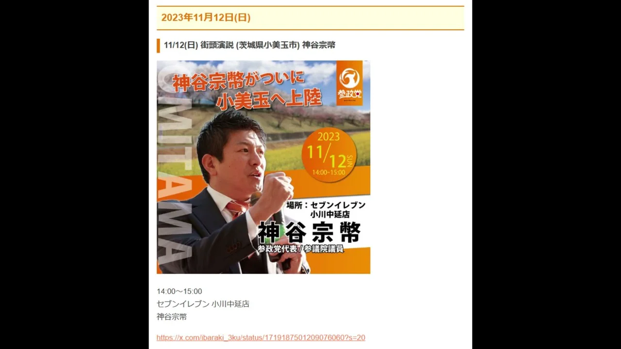 演説のお知らせ【参政党 街頭演説】11/12(日) 街頭演説 (茨城県小美玉市) #神谷宗幣 #参政党
