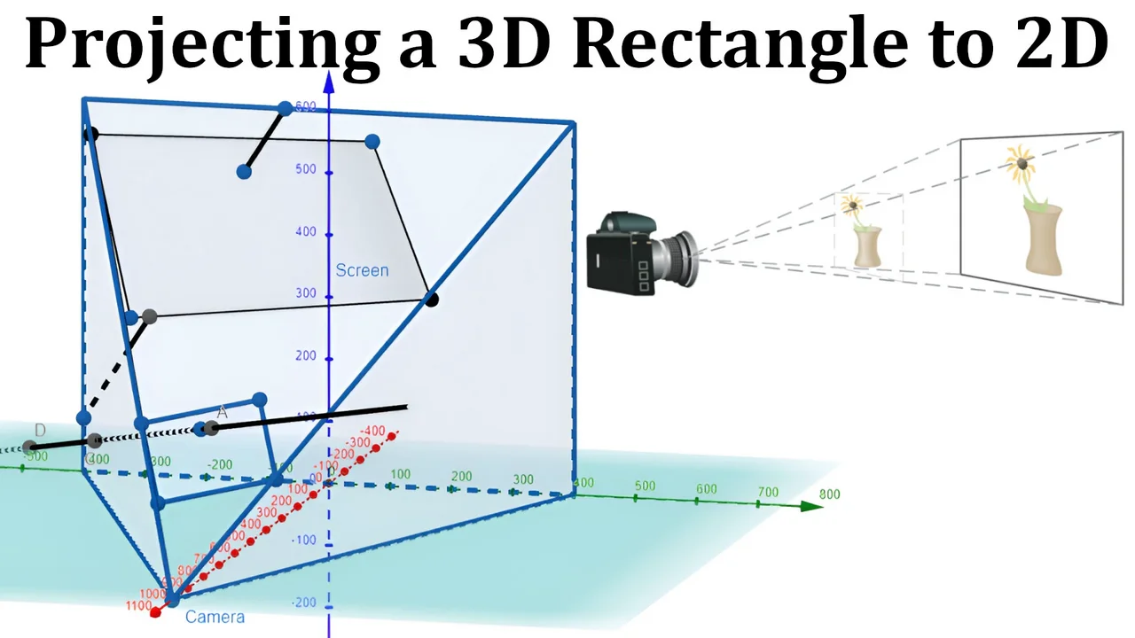 In this video I project a 3D rectangle onto a 2D screen, while also removing a segment of a line that is behind the rectangle so that it maintains its 3D perspective. I first project the given 3D rectangle coordinates using the 3D to 2D projection equation I derived earlier. Then, I determine the point of intersection of the 3D rectangle and 3D line. The next point that is needed is the point of intersection of the projected 2D line and the bottom portion of the projected 2D rectangle. Once I solve for these, I use GeoGebra to plot the projected line while removing the portion that is behind the rectangle. The resulting 3D chart is truly amazing! https://www.geogebra.org/calculator/twezjbu5