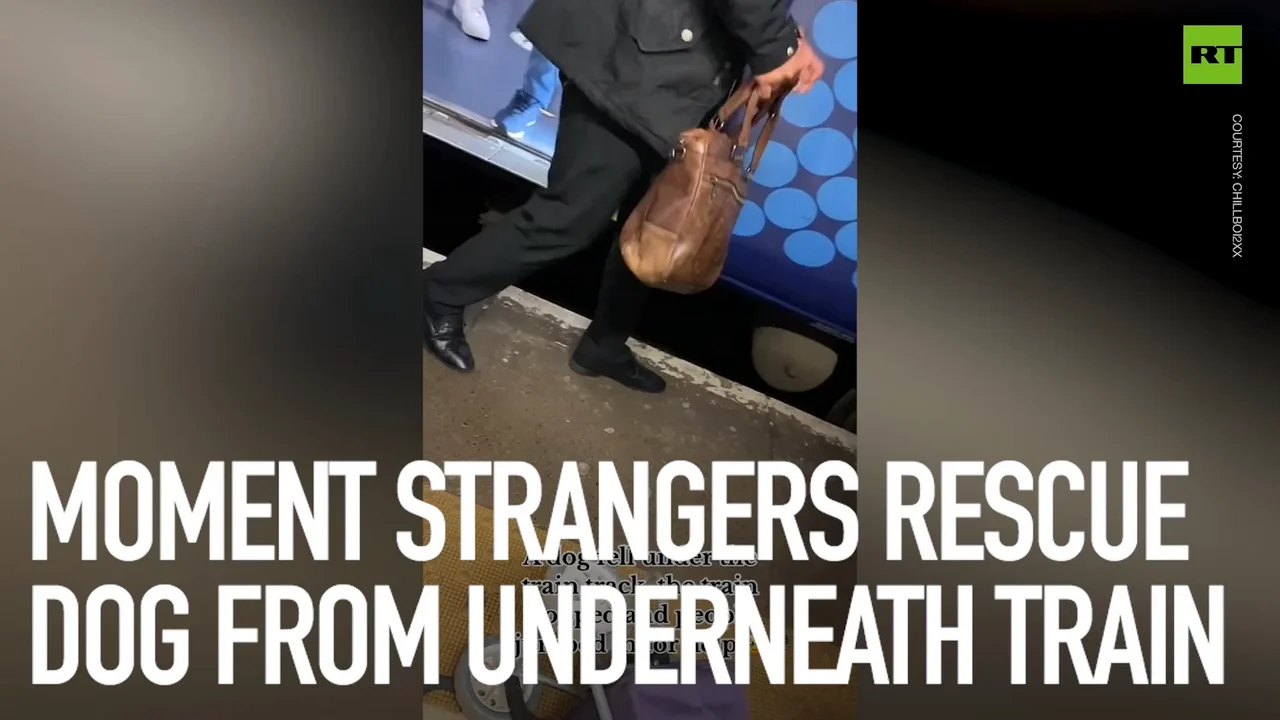 Moment strangers rescue dog from underneath train