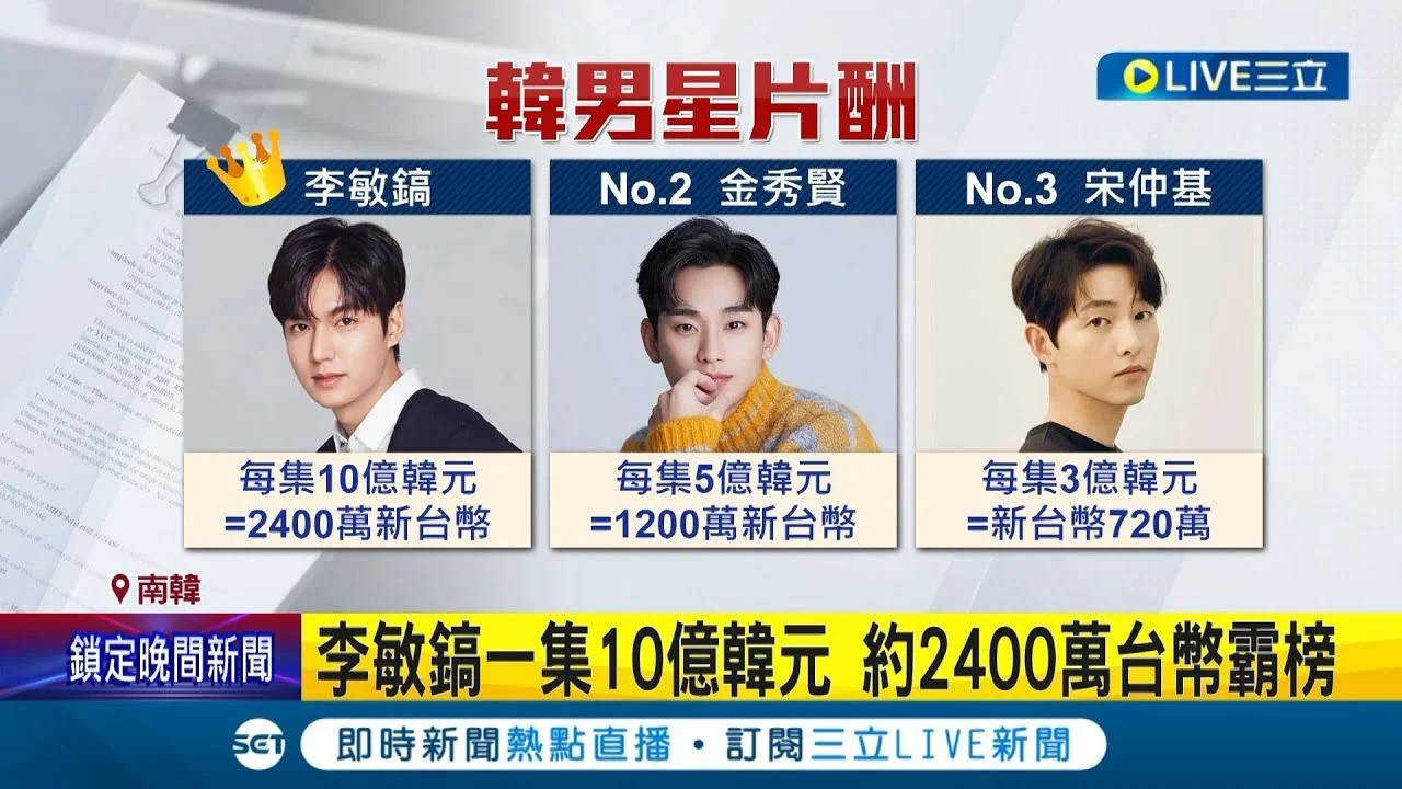 南韓男女演員片酬超很大!李善均染毒 每集台幣480萬片酬意外曝 李敏鎬一集10億韓元稱霸 女星宋慧喬一集2億韓元居冠 粉絲抱屈男女星差很多│【娛樂星世界】20231031│三立新聞台