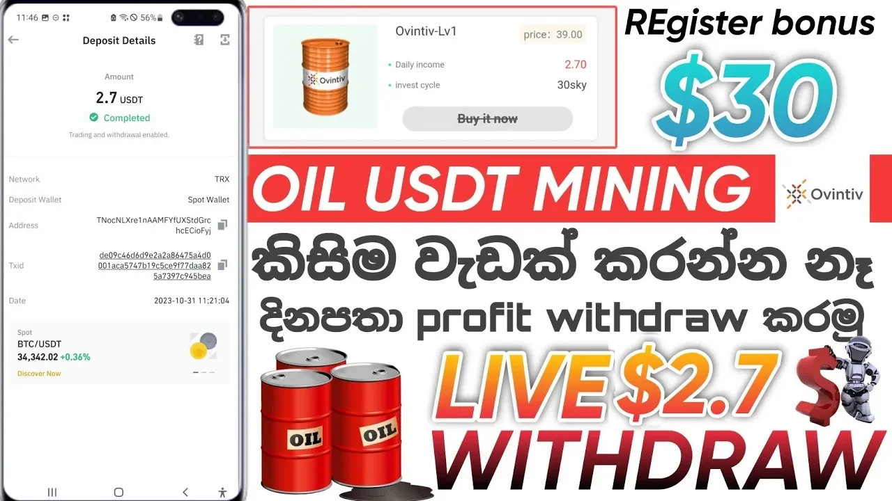 USDT mining || $30 bonus || $2.7 LIVE WITHDRAW PROOF ?? දවසගානෙ usdt කිසිමවැඩක් නොකර